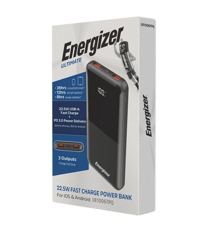 پاوربانک (PowerBank) مدل UE10067PQ از سری پاوربانکهای 10000 میلیآمپر شرکت انرجایزر و با بکار گیری فناوری فست شارژ به منظور شارژ رسانی سریع به تلفنهای هوشمند با سیستم عامل اندورید و iOS و تبلتها تولید شده است. پاوربانک UE10067PQ دارای 3 پورت میباشد که شامل یک پورت مشترک ورودی/خروجی تایپ سی، دو پورت خروجی USB-A است. پورت ورودی به همراه نرخ ولتاژ و جریان آن عبارتند از: پورت Type-C ورودی: 5V/3A – 9V/2A نرخ ولتاژ و جریان پورتهای خروجی این کالا نیز عبارتند از: پورت USB-A خروجی: 5V/3A – 9V/2A – 10V/2.25A – 12V/1.5A پورت Type-C خروجی: 5V/3A – 9V/2.22A – 12V/1.5A این پاوربانک با حداکثر توان خروجی 22.5 وات دارای نمایشگر دیجیتال جهت نمایش میزان شارژ است. همچنین این محصول دارای وزن 231 گرم است که در کلاس وزنی پاوربانکهای سبک وزن قرار دارد. ابعاد این شارژر همراه نیز 135 × 63 × 12 میلیمتر است. این پاوربانک در رنگ مشکی با ظرفیت 10000 میلی آمپر دارای باتری لیتیوم پلیمری است. همچنین این کالا از رویه ضد خش و جنس بدنه آن نیز پلاستیک ABS است که مهمترین خاصیت آن ضد اشتعال بودن کالاست. از اقلام همراه این پاوربانک فست شارژ نیز میتوان به دفترچه راهنما و کابل شارژر اشاره کرد.